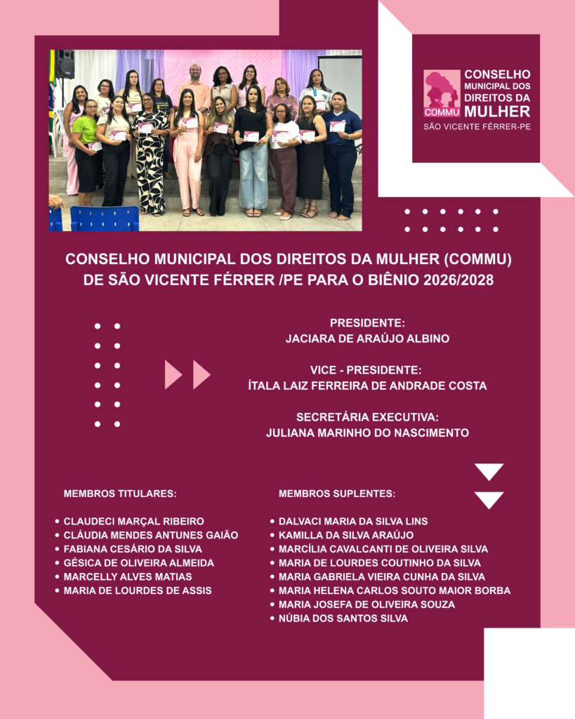 A Prefeitura de São Vicente Férrer divulgou a composição do Conselho Municipal dos Direitos da Mulher (COMMU) para o biênio 2026/2028, reforçando o compromisso do município com o fortalecimento das políticas públicas voltadas às mulheres.