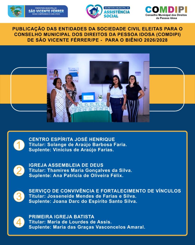 A Prefeitura Municipal de São Vicente Férrer, por meio da Secretaria Municipal de Assistência Social, torna pública a relação das entidades da sociedade civil eleitas para compor o Conselho Municipal dos Direitos da Pessoa Idosa (COMDIPI) no biênio 2026–2028.
